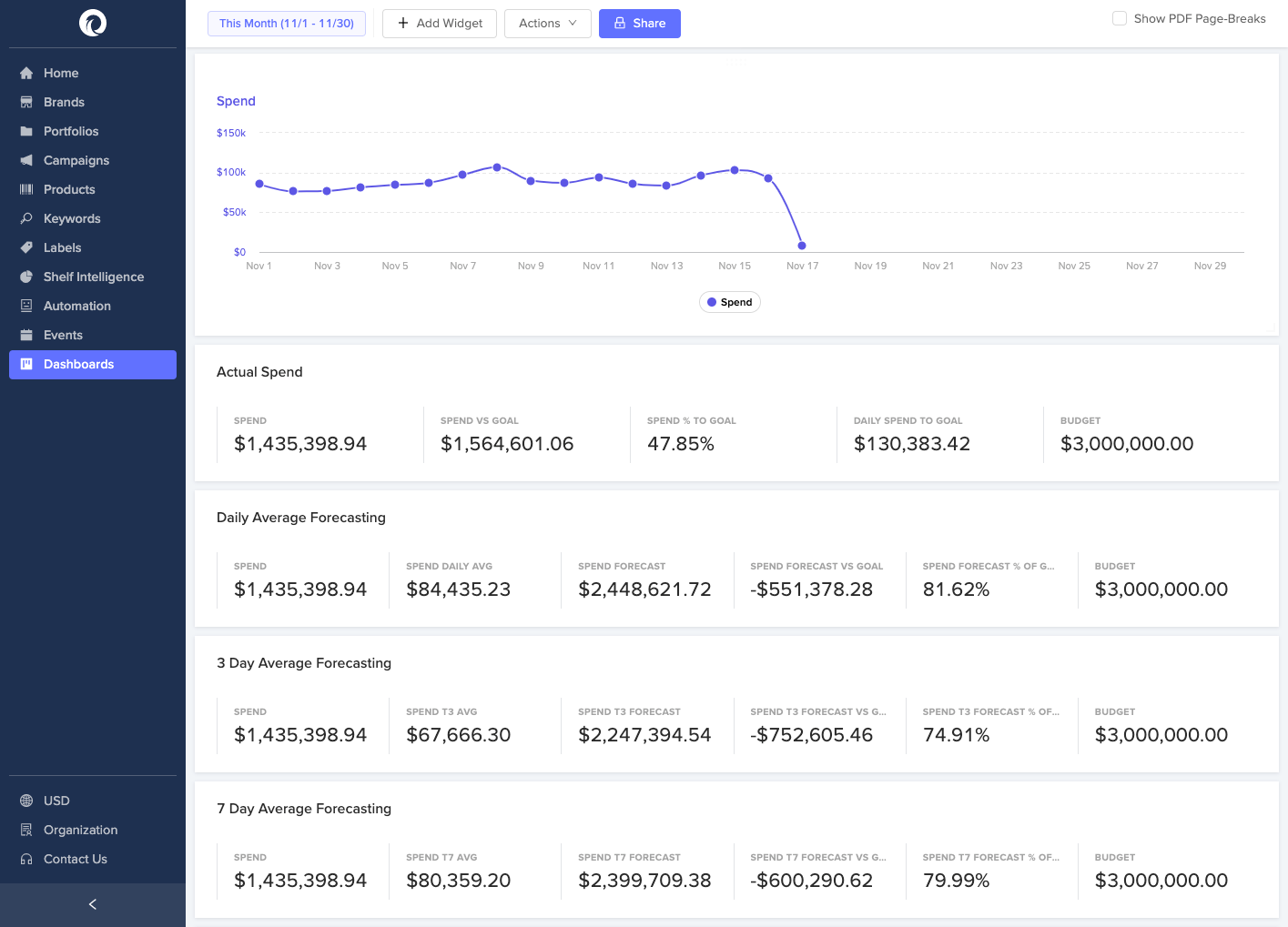 You can now create Dashboard widgets where daily averages of Spend can be seen, along with how that pace would forecast to the end of a time period and how it relates to a specified budget (Spend Goal).