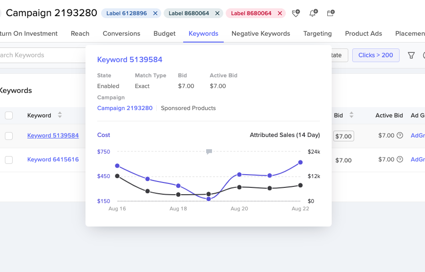 When viewing keywords in tables, you can now hover over a keyword to view an at-a-glance summary of the keyword details as well as a spend/sales line chart.
