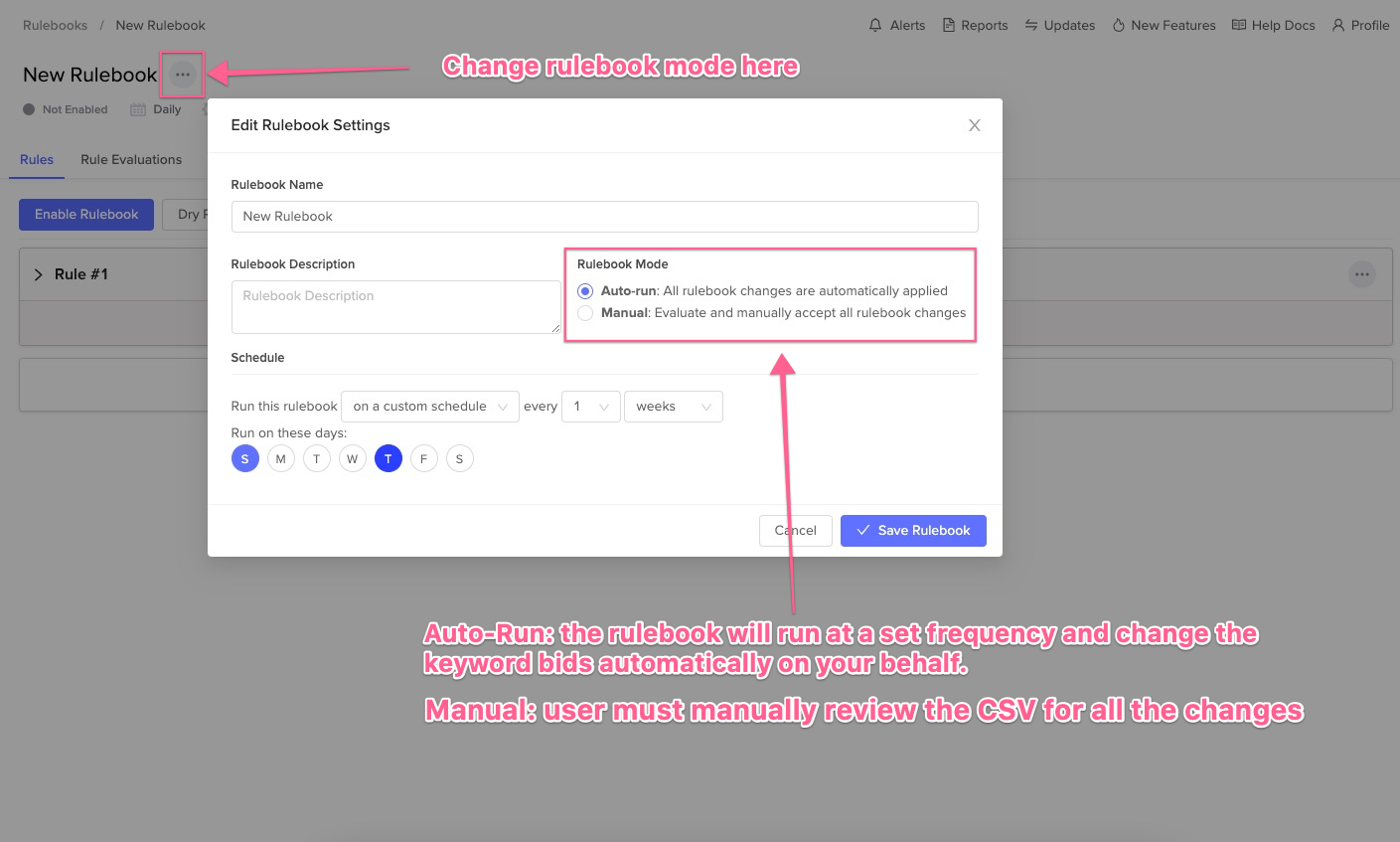 To use automatic rulebooks, simply set the rulebook settings to "Auto-Run" and select the time intervals (e.g. Daily, Every Monday and Friday, etc.).