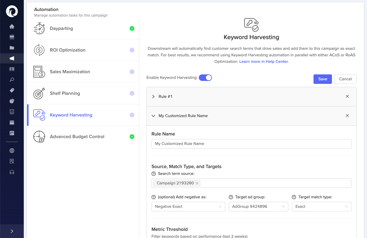For our Keyword Harvesting automation, you can now set multiple harvesting "rules" on the same campaign. Each rule contains the same elements that encompassed Keyword Harvesting in the past:
